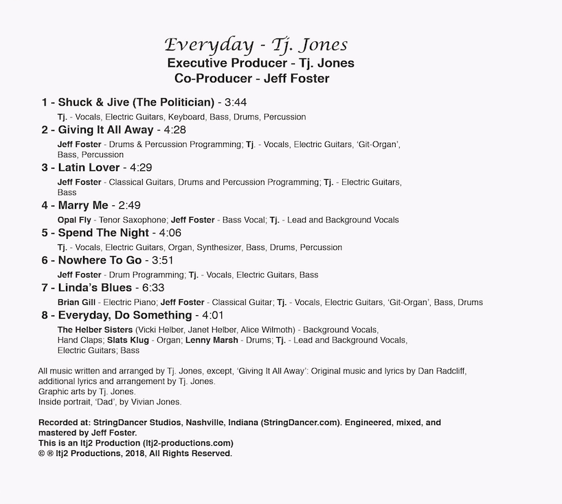 Play this video for a sampling of the music, then read on for the backstory of the making of Tj. Jones’ 2018 debut CD project, Everyday, which I had the pleasure of co-producing.