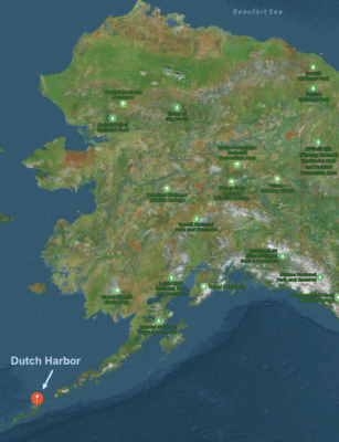 By way of background: Dutch Harbor is the largest fishing port in the US, and one of the largest on the planet… an oasis for bald eagles but an otherwise bare and isolated rock, the last habitable island located near the western end of the Aleutian chain. During “the A season” (January through March), intrepid fishermen from all over the world travel there to make mountains of cash doing some of the most dangerous work there is (The discovery Channel’s Deadliest Catch was filmed there).
