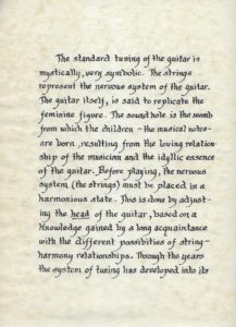 So here you have a gifted guitarist’s vision of the instrument as it was in 1975, when he was still in his early 20s. I can say with confidence that Stanley’s awareness of the guitar, of music, and how he would communicate all that has evolved greatly in the ensuing years. Nonetheless, this manuscript stands as a timeless and accurate presentation of the basics of the guitar, and also as a work of calligraphic art in and of itself.