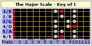 NOTE: As shown, the scale is in the key of C, but remember this fingering does not contain any open strings, and thus is a movable scale which can accommodate any key by simply positioning it at the appropriate 6th-string root tone on the fretboard.
