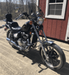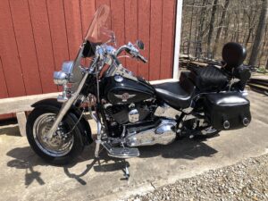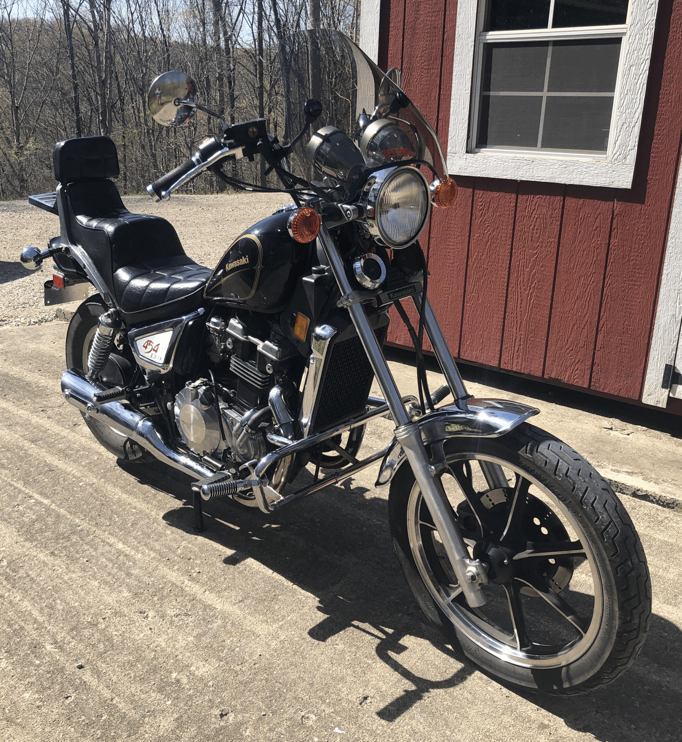 We rode that fat old cruiser for several years, traveling all over south-central Indiana. But once we moved to Brown County, the Guzzi proved a bit unwieldy for the precipitous stone roads at Greenbriar Lake, so we sold it to buy an ’89 Kawasaki 450, a nimble and much more manageable bike. I really enjoyed the Kaw, but by then we were doing better financially and had started thinking about getting a Harley.